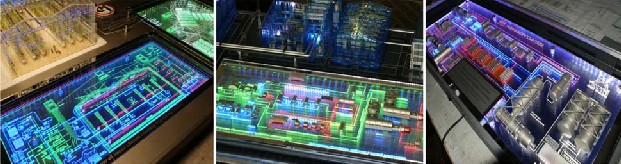 Для повышения качества Ваших будущих макетов, мы экспериментируем с новинками современной техники (встроенный компьютер с сенсорным экраном и контроллером для управления процессами на макете, минивидеокамеры, различные источники света, кинематика, дистанционное управление, имитаторы дыма и огня) и применяем их не только в технологических, но и в архитектурных и градостроительных макетах.